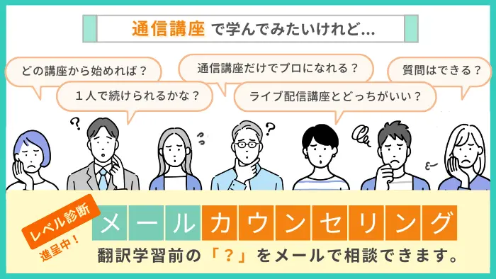 マンツーマンで学習プランをアドバイスいたします。これまでのご経験やご興味、語学レベル、ライフスタイルにあわせた最適な学び方と、仕事を始めるまでのイメージをご提案します。学習からお仕事の相談まで幅広く応じますので、学習開始前だけでなく受講中や受講後もお気軽にご利用ください。方法はお電話またはオンラインをお選びいただけます。