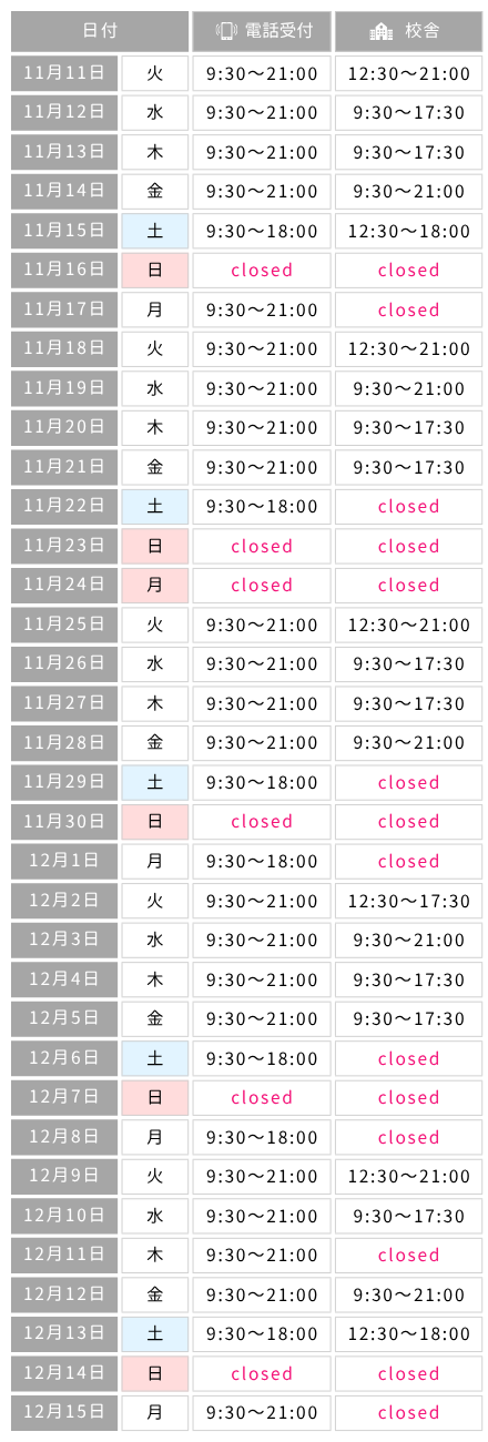 営業時間のお知らせ お知らせ 2025.11.11 フェロー・アカデミーでは、授業にあわせて営業時間を変更させていただいております。お電話受付時間、校舎開校時間は下記をご覧ください。 なお一部テレワークにて対応しておりますため、お電話が繋がりにくい場合は、お手数ですがお問合せフォームよりお問合せください。