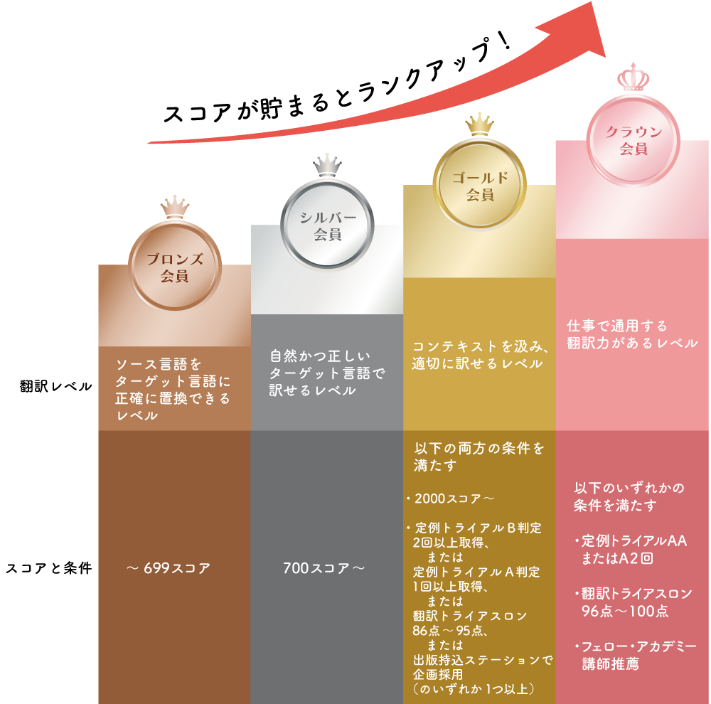 貯めたスコアは合算でき、スコアが貯まるとアメリアで翻訳レベルを表す「ランク」がアップします!(ランクはアメリア会員のみ対象)。